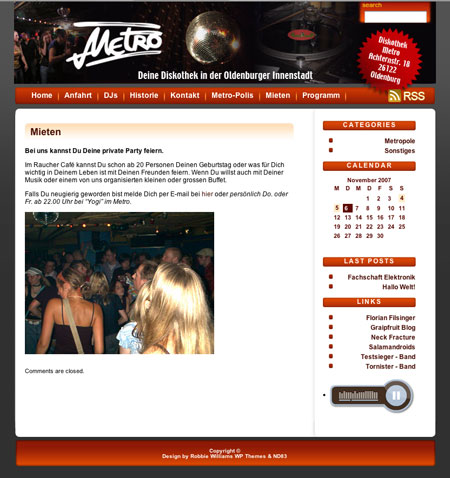 Webdesign and WordPress based programmingvon ffNovember 7, 2007Oktober 16, 2008Just working on the web presence of Oldenburgs discothek „Metro“.