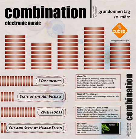 Gast-DJs: Edior, Jörn Kaltenbach, Da.Ca.Sa, Carlo, Addy Attention, Florian Filsinger | Resident DJ-Team: Phish & Fertig (a.k.a. isamsoe) | Gast-VJ: Telekolonie | Nightcut: Haircuts by Haarmäleon | AK: 4 € + 1€ Verzehr
