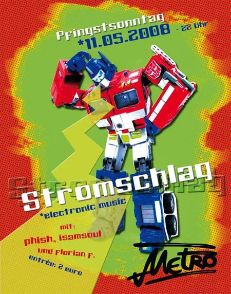 Stromschlag 11.05.von ffMai 7, 2008Oktober 7, 2009 Stromschlag in da Metro, featuring Phish, Isamoe and me. Best of Minimal, Techno, Electro and Drum&Bass. Come and enjoy! Pfingstsonntag, 11.05.2008